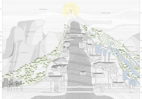 The mountains Sugarloaf, Corcovado and a profile of hills around Guanabara Bay physically and symbolically mark the Carioca landscapes. “I am attracted to free-flowing, sensual curves,” noted Oscar Niemeyer, “the curves that I find in the mountains of my country, in the sinuousness of its rivers, in the waves of the ocean, and on the body of the beloved woman.” While the figure of the city has developed in relation to its geographical contours, the rapid urbanization of Rio de Janeiro has often butted against its mountain ranges. Along with the expansive informal housing situation, the city currently faces the challenges of growth and provision of support infrastructure such as energy facilities, logistic zones, landfills as well as steel and petrochemical processing industries. Often externalized from cities, such urban programs they consume valuable real estate and generate undesired environmental costs such as urban heat, gas, smoke, waste and ash. Beyond the duality of “urban externality” and “idealized Nature”, Belly of A Mountain proposes to organize the city’s urban infrastructures within a series of excavated mountain bellies. The project embodies in a critical twist the urban desire to having the cake and eat it too – by preserving the formal green shell of the mountains all while utilizing their topography as potential internal volume to accommodate such undesired infrastructures. The mountain is simultaneously the formal icon of the city, its lungs, and the belly that takes in the city’s cemeteries, water purification plants and other industrial facilities. Airborne pollutants, municipal waste, grey water, and dead human bodies are processed in the belly-machine into clean energy, purified air, and fertilizers to the city. The emptied mountain, a series of crematorium grottos, is as well the city’s sanctuary. At sunset, Cariocas retreat into the belly of the machine. From its peaks, they to overview a silhouette of mountain ranges and chimney smoke mists all while chanting the love of their recently baptized city as World Heritage urban cultural landscape.