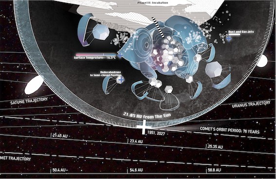 The Halley Armada spacecraft is launched at the moment Comet Halley approaches the Earth in 2062. The mission patch reads: Love your Monsters. The space probe is composed of 30 dodecahedron modules, each of which hosts a hairy palpal bulb that transfers life cells and is enveloped by a soft membrane. Landing in Halley’s Central Depression, the parasite fleet leeches off the body of its host. In this primal moment of insemination, the Halley Armada implants its feeding-stem to suck liquid from the comet’s nucleus that is at mostly ice from water.