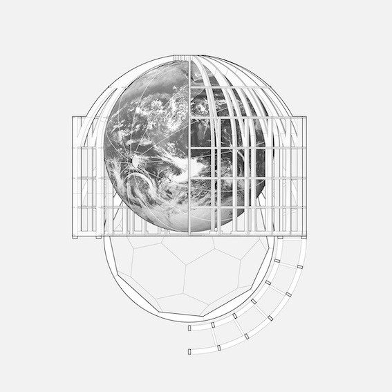 Blue Marble Circus is a 1/10 miniature of the Pantheon that exposes the spherical “architecture of the cosmos” inscribed within. The structure is a 3D construction of an ecorché drawing; it peels plywood ribs off to reveal and stage the Blue Marble. The icon symbol of the environmental movement is represented in a material expression that reckons with the applications of fossil fuels in the construction industry — extruded polystyrene foam, plastics. The 10-foot diameter globe is made of thirty-two white foam polygon panels (twelve pentagons and twenty hexagons), which are machined on a five-axis CNC router for a curved surface and a polygonal cut on the inside. The totality is shrink-wrapped in marine industrial film. The globe is also a camera obscura; the visitor peeks into the hallow chamber, and after a minute or so, when their eyes have adjusted to the darkness, so they recognize the image of the world projected into the interior facets of the globe. The miniature of the Pantheon — both the conceptual diagram and optical experience — is an architectural invitation to re-learn, like Atlas, how to carry the world and all there is above it on our shoulders.