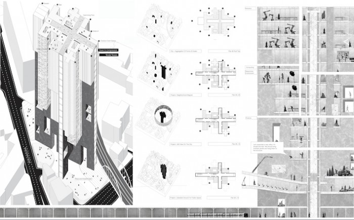 Can the skyscraper operationalize its power as the symbolic artifice par excellence to programmatically intensify such culture-programs all while organically growing into the clouds and beyond, a 21st century variant of Jack and the Beanstalk? The project proposes an organic cloud city, which grows in time by aggregating different programs, forms and scales around a single vertical structure. The skyscraper is composed of two main elements: a central cruciform tower in compression and a series of peripheral tensile towers. The compression tower is the structural and mechanical core of the project. It contains elevators, stairs, mechanical rooms, shafts and storage spaces. Such liberates the tensile towers to be pure activity spaces. They are of different forms and scales and can be grouped to form larger floor plate sizes or kept independent. The flexibility of the project arises from the different floor type combination horizontally or vertically. Responding to different events in the city, floors can be added or removed as a series of prefabricated floors and partition walls and facades.