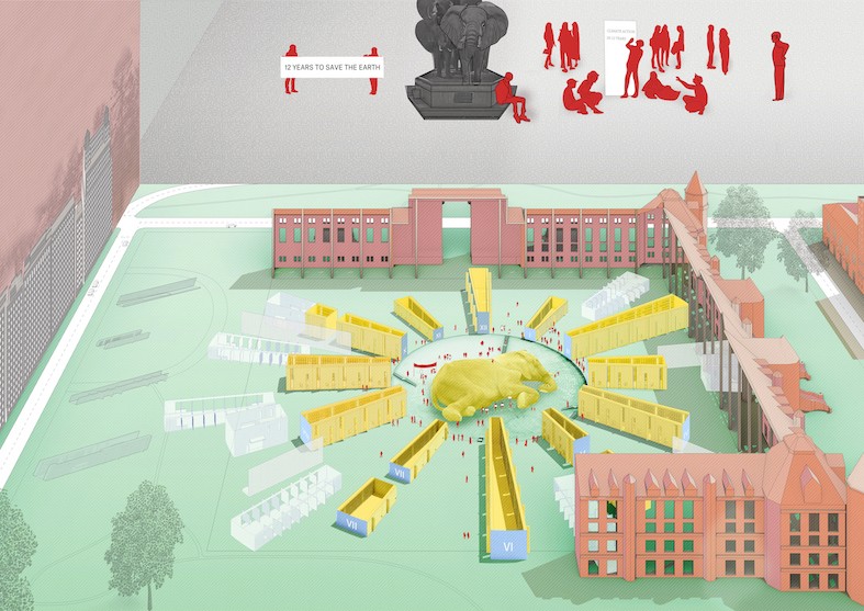 Elephant in the Room is a speculative ecofeminist fable for the climate crisis. The project addresses the elephant in the room—the climate crisis—by telling the story of one elephant who takes action to combat environmental injustice and climate change. The American Museum of Natural History in New York contains famous taxidermy dioramas, many of which were ‘collected’ (read killed) on the Smithsonian-Roosevelt African Expedition (1909-1910). The African Elephant Matriarch comes to life and storms out of the museum to stampede through the streets and protest patriarchy and networks of fossil-fuel funding. The pair of drawings is shot/countershot diorama setup. The 6-minute fable is written and visualized by Design Earth and narrated, in rhyming verse, by Donna Haraway.