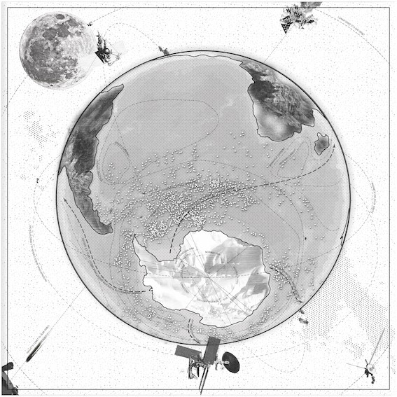 In 1976, in response to the growth of desalination industries in a dry region with high water demands, Saudi Prince Mohammed Al Faisal created a venture company to study if an iceberg could be towed from Antarctica to Jeddah. He even brought experts together to debate this hypothesis at “First International Conference and Workshops on Iceberg Utilization for Fresh Water Production, Weather Modification and Other Applications” at Iowa State University. Prince Al Faisal wondered: why simply allow the billions liters of fresh and pure water that make up icebergs to be diluted in oceans if “an iceberg project is a better enterprise than oil?” After all, global ice trade was a lucrative industry in the nineteenth century. The conference ended in disagreement on the possibility of iceberg-towing across the tropics. The idea however remains alive and potentially more alluring as climate change puts Antarctica on the world’s mind. Of Oil and Ice weaves together two concerns brought forth by climate change — melting glaciers in Antarctica and energy intensive desalination industries in the Arabian Gulf — in a proposal to haul icebergs from Antarctica to Hormuz Strait. Antarctica’s ice is no longer the enemy it had been for early explorers. Declared in 1895 as the last undiscovered place on earth by the Royal Geographical Society, and without human natives, Antarctica has since been predominantly defined by its mapping. During the Cold War, the Antarctic Treaty System (ATS) organized Antarctica into a series of polar sectors radiating from the South Pole to contain contemporary claims of national sovereignty as well as any future possible claims put forth should economic resources be discovered. It deemed the continent a “natural reserve devoted to peace and science.” In 2048, the treaty’s ban on development and extraction will be renegotiated under the pressures of international competition over resources.
