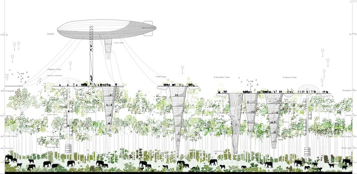 The project uses the architectural image of the tower to frame environmental transformations. It shifts the iconicity of the tower on its head by deploying tensile structures at the geographic scale. Towers on Wire float atop a site where reforestation plans have been launched. Positioned in the perimeter of a forest cut, the temporary tensile structures allow scientists and environmentalists to witness the effects of deforestation and monitor the growth of a newly planned forest. The collapsible structures are suspended from a circular ring that rests on the canopy of the forest all while avoiding contact with the ground. Their height is inverted as they dip into the depths of the forest to disappear in the crowns of the trees. The towers harness the humidity of the forest constructing an environment where the newly planted trees can grow again into the forest. Four typologies of towers are juxtaposed to form the community: research, recreation, rest, and recycle. The island-platforms house nodes of dense human inhabitation floating on the leaves of the forest. The green horizon, the canopy of the rainforest, is the collective datum of the project.